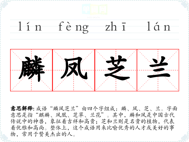 | 麟凤芝兰 | 麟凤:麒麟、凤凰,比喻高尚的人;芝兰:比喻才质之美。指人的品德高尚,气质优美。 |