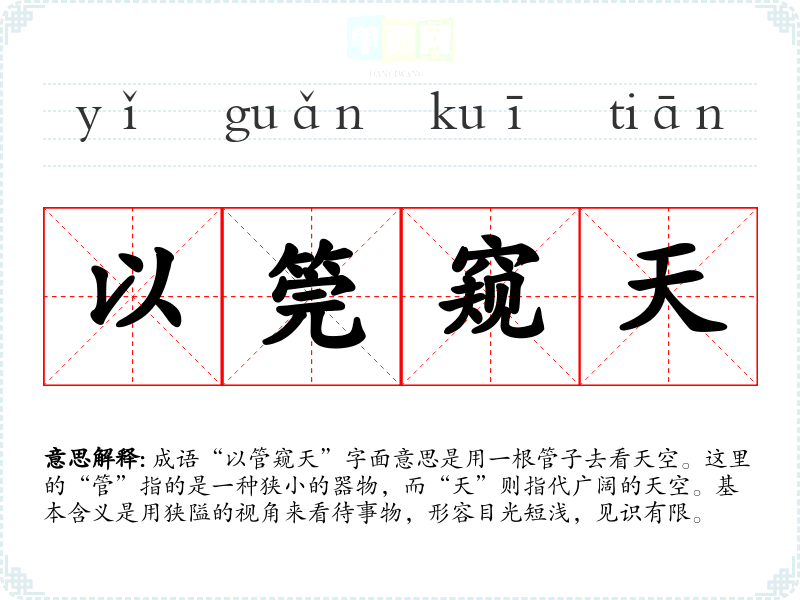 成语“以管窥天”字面意思是用一根管子去看天空。这里的“管”指的是一种狭小的器物,而“天”则指代广阔的天空。基本含义是用狭隘的视角来看待事物,形容目光短浅,见识有限。