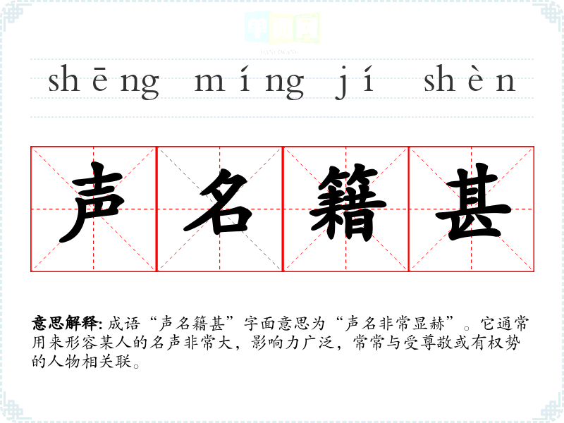 成语“声名籍甚”字面意思为“声名非常显赫”。它通常用来形容某人的名声非常大,影响力广泛,常常与受尊敬或有权势的人物相关联。