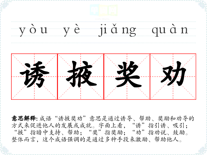 成语“诱掖奖劝”意思是通过诱导、帮助、奖励和劝导的方式来促进他人的发展或成就。字面上看,“诱”指引诱、吸引;“掖”指暗中支持、帮助;“奖”指奖励;“劝”指劝说、鼓励。整体而言,这个成语强调的是通过多种手段来激励、帮助他人。