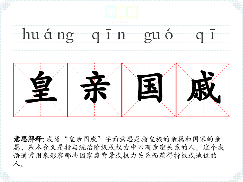 成语“皇亲国戚”字面意思是指皇族的亲属和国家的亲属,基本含义是指与统治阶级或权力中心有亲密关系的人。这个成语通常用来形容那些因家庭背景或权力关系而获得特权或地位的人。