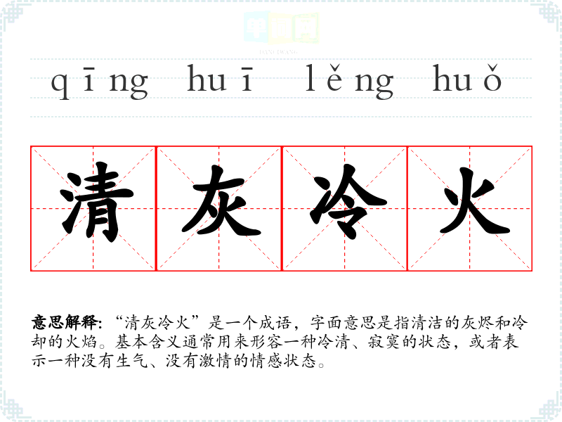 “清灰冷火”是一个成语,字面意思是指清洁的灰烬和冷却的火焰。基本含义通常用来形容一种冷清、寂寞的状态,或者表示一种没有生气、没有激情的情感状态。