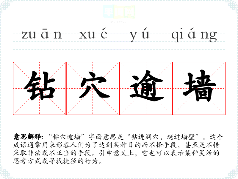 “钻穴逾墙”字面意思是“钻进洞穴,越过墙壁”。这个成语通常用来形容人们为了达到某种目的而不择手段,甚至是不惜采取非法或不正当的手段。引申意义上,它也可以表示某种灵活的思考方式或寻找捷径的行为。