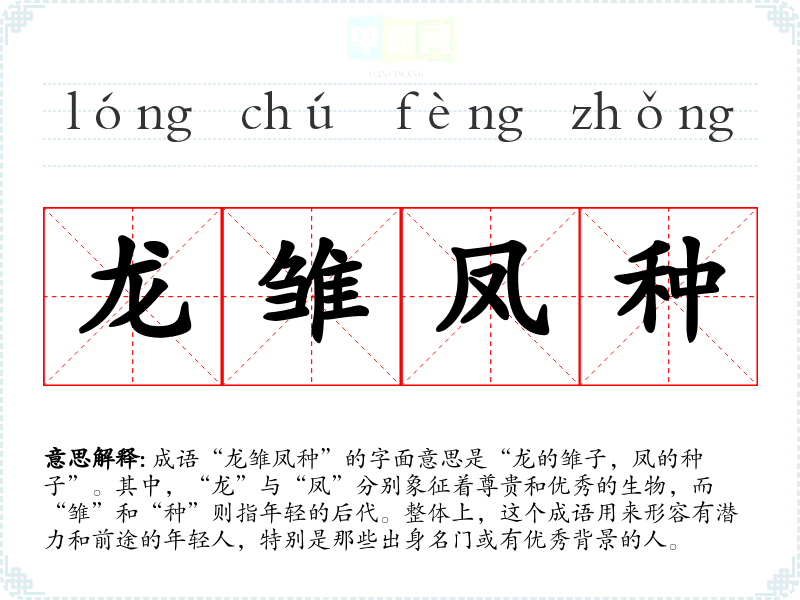 成语“龙雏凤种”的字面意思是“龙的雏子,凤的种子”。其中,“龙”与“凤”分别象征着尊贵和优秀的生物,而“雏”和“种”则指年轻的后代。整体上,这个成语用来形容有潜力和前途的年轻人,特别是那些出身名门或有优秀背景的人。