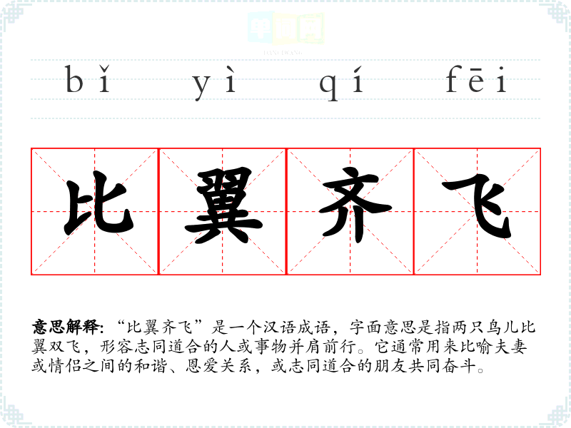 “比翼齐飞”是一个汉语成语,字面意思是指两只鸟儿比翼双飞,形容志同道合的人或事物并肩前行。它通常用来比喻夫妻或情侣之间的和谐、恩爱关系,或志同道合的朋友共同奋斗。