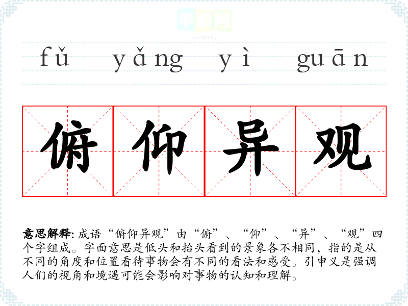 通过对“俯仰异观”的学,我深刻意识到视角的重要性。在语言学和表达中,理解并尊重不同的观点不仅能丰富自己的思维,还能帮助建立良好的人际关系。这一成语提醒我们,世界是多元的,只有开放心态,才能更好地理解他人和自己。