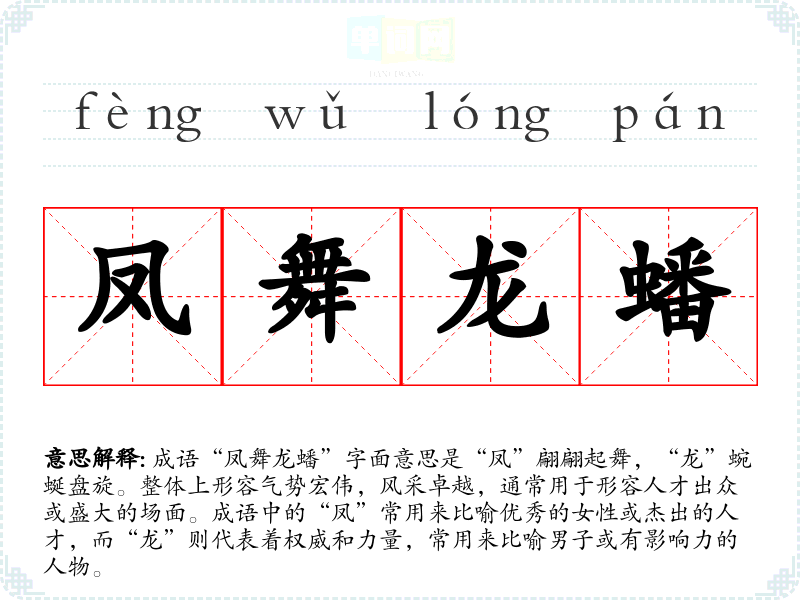 成语“凤舞龙蟠”字面意思是“凤”翩翩起舞,“龙”蜿蜒盘旋。整体上形容气势宏伟,风采卓越,通常用于形容人才出众或盛大的场面。成语中的“凤”常用来比喻优秀的女性或杰出的人才,而“龙”则代表着权威和力量,常用来比喻男子或有影响力的人物。