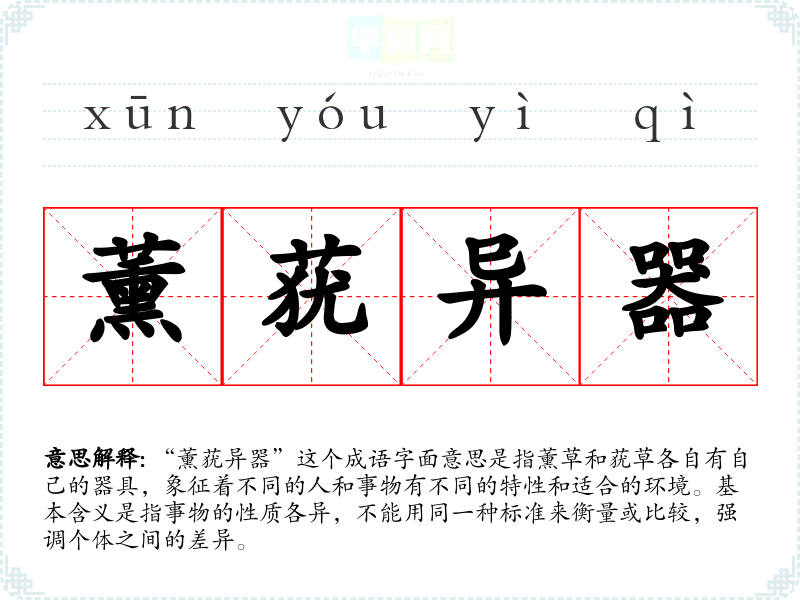 “薰莸异器”这个成语字面意思是指薰草和莸草各自有自己的器具,象征着不同的人和事物有不同的特性和适合的环境。基本含义是指事物的性质各异,不能用同一种标准来衡量或比较,强调个体之间的差异。