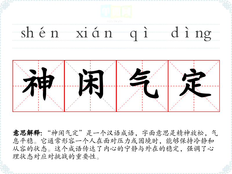 “神闲气定”是一个汉语成语,字面意思是精神放松,气息平稳。它通常形容一个人在面对压力或困境时,能够保持冷静和从容的状态。这个成语传达了内心的宁静与外在的稳定,强调了心理状态对应对挑战的重要性。