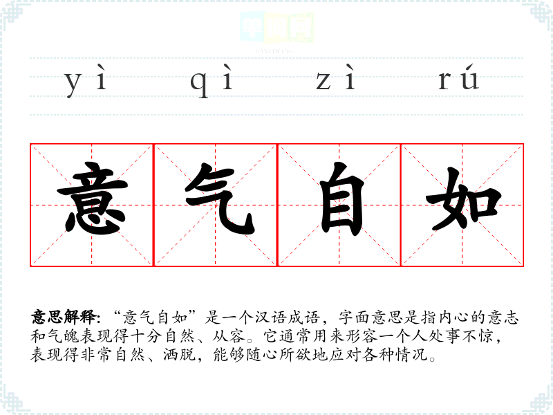 “意气自如”是一个汉语成语,字面意思是指内心的意志和气魄表现得十分自然、从容。它通常用来形容一个人处事不惊,表现得非常自然、洒脱,能够随心所欲地应对各种情况。