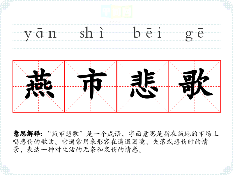 “燕市悲歌”是一个成语,字面意思是指在燕地的市场上唱悲伤的歌曲。它通常用来形容在遭遇困境、失落或悲伤时的情景,表达一种对生活的无奈和哀伤的情感。