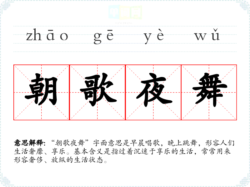 “朝歌夜舞”字面意思是早晨唱歌,晚上跳舞,形容人们生活奢靡、享乐。基本含义是指过着沉迷于享乐的生活,常常用来形容奢侈、放纵的生活状态。