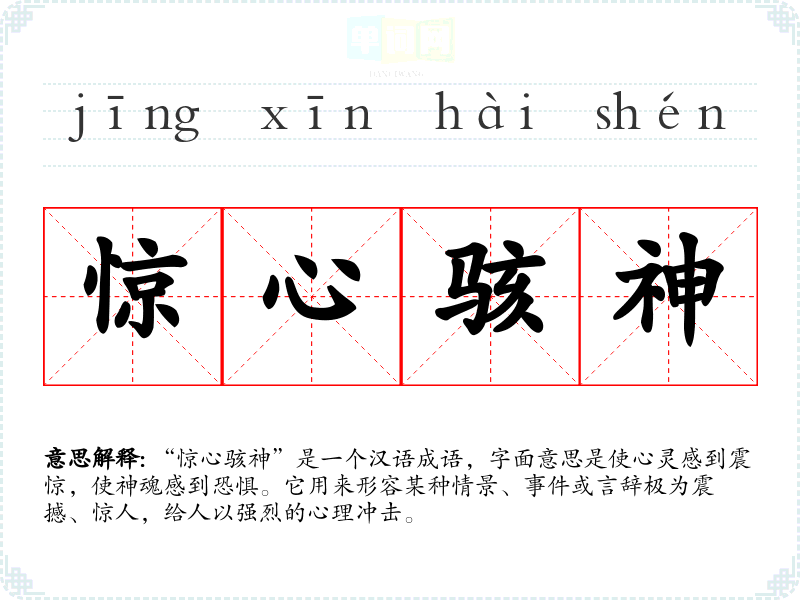 | 惊心骇神 | 指内心感到十分震惊。 |