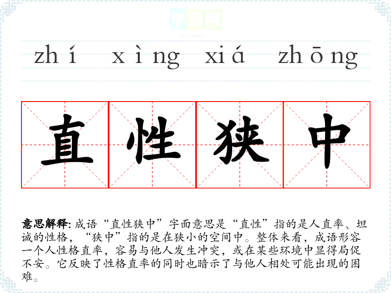 成语“直性狭中”字面意思是“直性”指的是人直率、坦诚的性格,“狭中”指的是在狭小的空间中。整体来看,成语形容一个人性格直率,容易与他人发生冲突,或在某些环境中显得局促不安。它反映了性格直率的同时也暗示了与他人相处可能出现的困难。