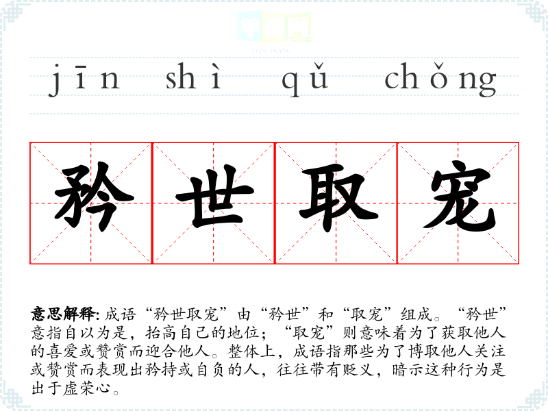 | 矜世取宠 | 矜:夸耀;宠:荣耀。炫耀才华,博取时誉。 |