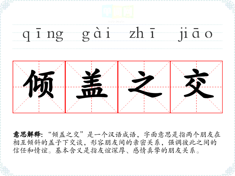 “倾盖之交”是一个汉语成语,字面意思是指两个朋友在相互倾斜的盖子下交谈,形容朋友间的亲密关系,强调彼此之间的信任和情谊。基本含义是指友谊深厚、感情真挚的朋友关系。