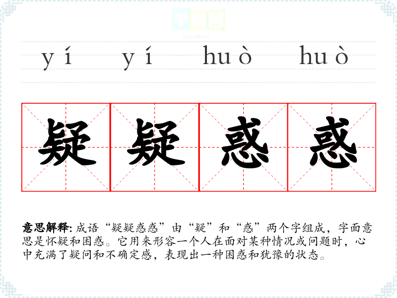 成语“疑疑惑惑”由“疑”和“惑”两个字组成,字面意思是怀疑和困惑。它用来形容一个人在面对某种情况或问题时,心中充满了疑问和不确定感,表现出一种困惑和犹豫的状态。