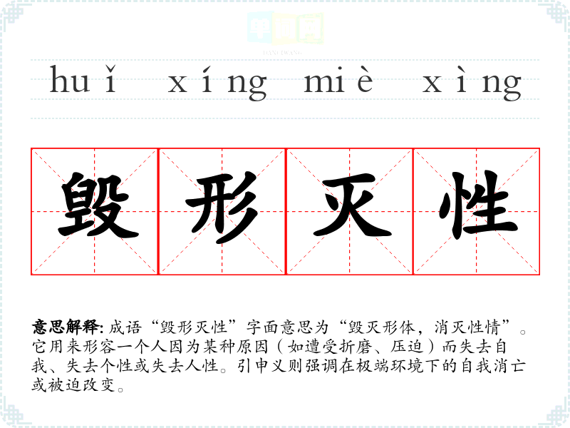成语“毁形灭性”字面意思为“毁灭形体,消灭性情”。它用来形容一个人因为某种原因(如遭受折磨、压迫)而失去自我、失去个性或失去人性。引申义则强调在极端环境下的自我消亡或被迫改变。