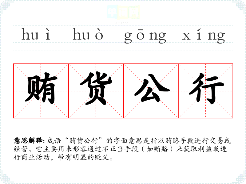 成语“贿货公行”的字面意思是指以贿赂手段进行交易或经营。它主要用来形容通过不正当手段(如贿赂)来获取利益或进行商业活动,带有明显的贬义。