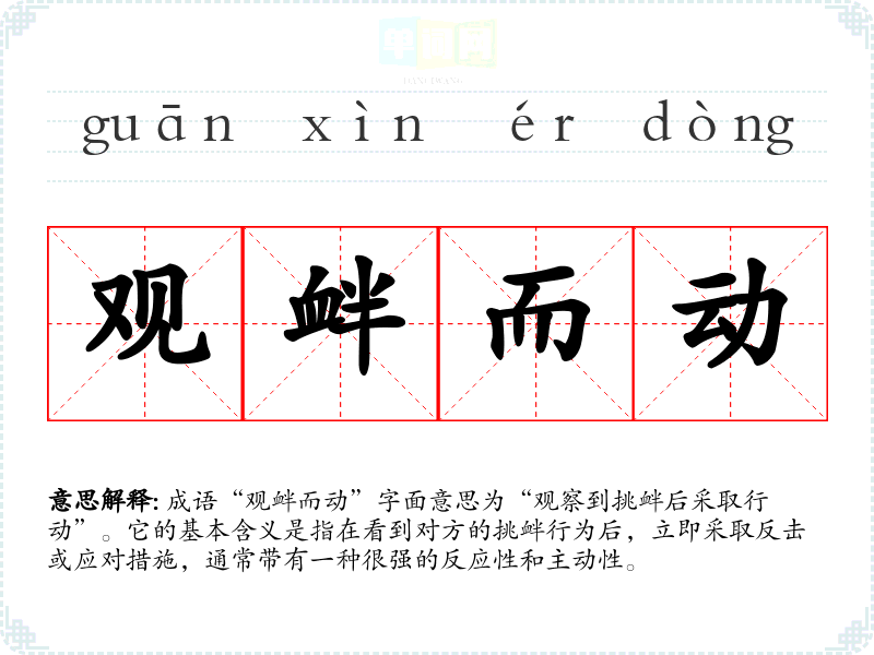成语“观衅而动”字面意思为“观察到挑衅后采取行动”。它的基本含义是指在看到对方的挑衅行为后,立即采取反击或应对措施,通常带有一种很强的反应性和主动性。