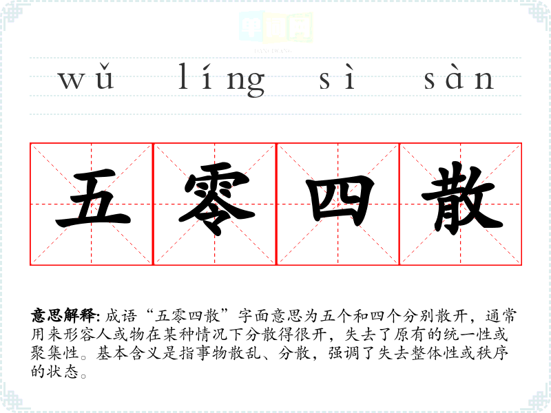 成语“五零四散”字面意思为五个和四个分别散开,通常用来形容人或物在某种情况下分散得很开,失去了原有的统一性或聚集性。基本含义是指事物散乱、分散,强调了失去整体性或秩序的状态。