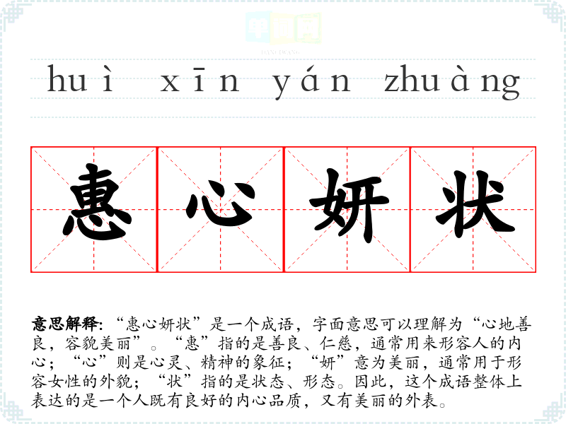 “惠心妍状”是一个成语,字面意思可以理解为“心地善良,容貌美丽”。“惠”指的是善良、仁慈,通常用来形容人的内心;“心”则是心灵、精神的象征;“妍”意为美丽,通常用于形容女性的外貌;“状”指的是状态、形态。因此,这个成语整体上表达的是一个人既有良好的内心品质,又有美丽的外表。