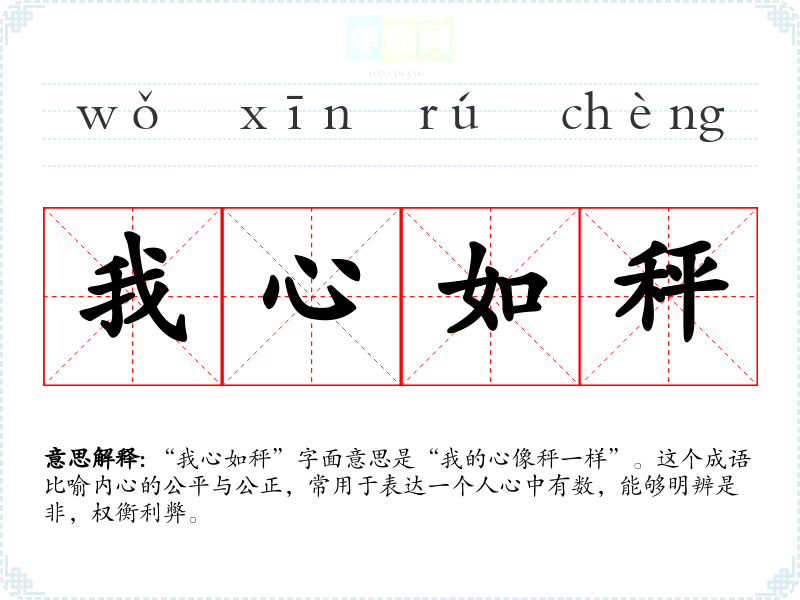 “我心如秤”字面意思是“我的心像秤一样”。这个成语比喻内心的公平与公正,常用于表达一个人心中有数,能够明辨是非,权衡利弊。