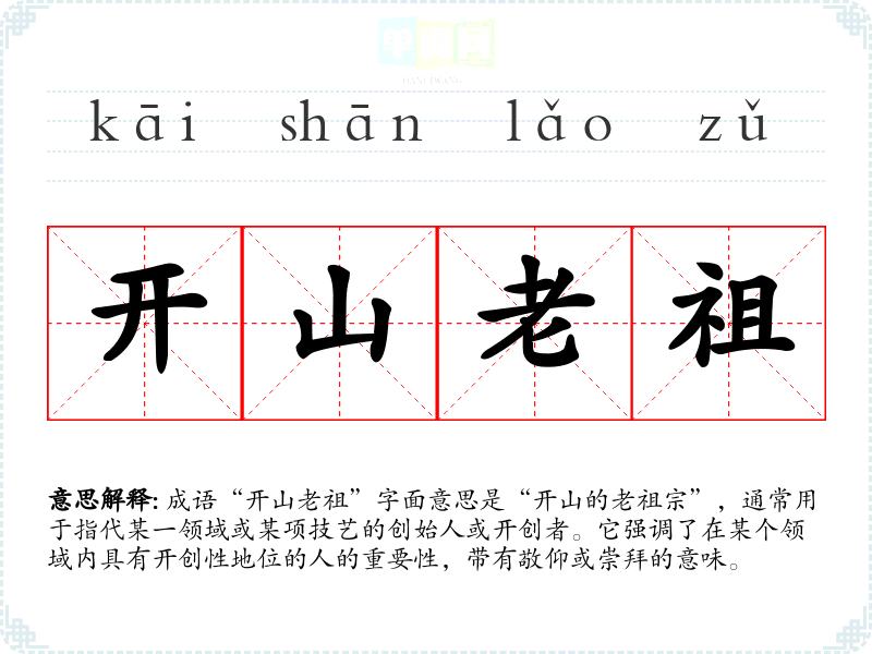 成语“开山老祖”字面意思是“开山的老祖宗”,通常用于指代某一领域或某项技艺的创始人或开创者。它强调了在某个领域内具有开创性地位的人的重要性,带有敬仰或崇拜的意味。