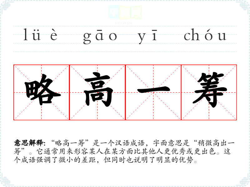 “略高一筹”是一个汉语成语,字面意思是“稍微高出一筹”。它通常用来形容某人在某方面比其他人更优秀或更出色。这个成语强调了微小的差距,但同时也说明了明显的优势。