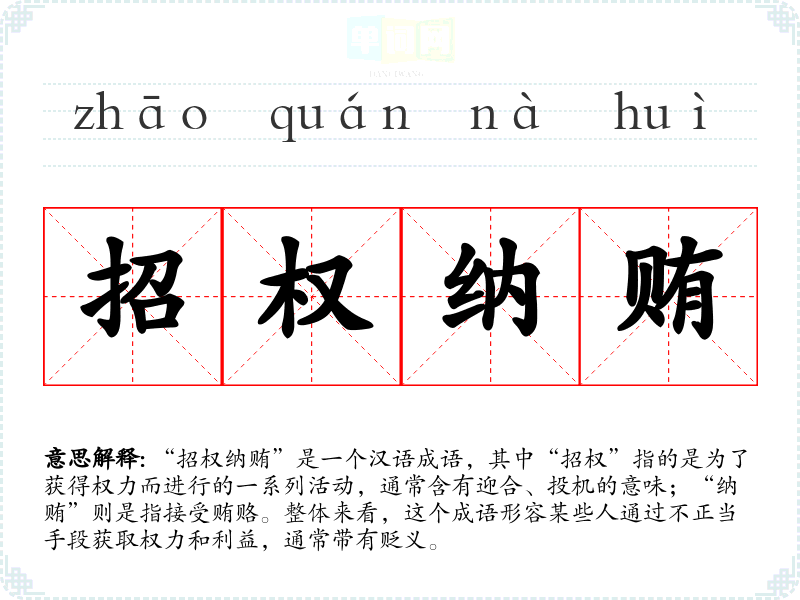 “招权纳贿”是一个汉语成语,其中“招权”指的是为了获得权力而进行的一系列活动,通常含有迎合、投机的意味;“纳贿”则是指接受贿赂。整体来看,这个成语形容某些人通过不正当手段获取权力和利益,通常带有贬义。