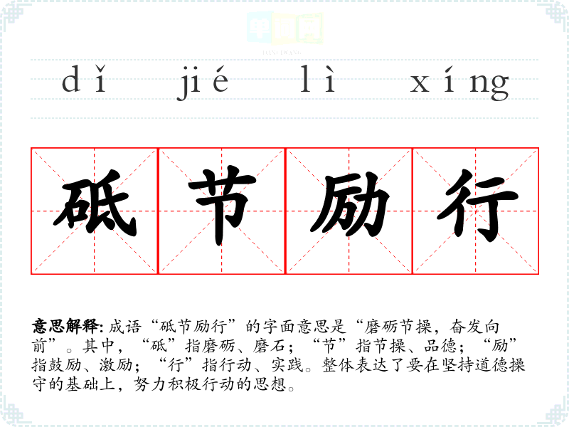 成语“砥节励行”的字面意思是“磨砺节操,奋发向前”。其中,“砥”指磨砺、磨石;“节”指节操、品德;“励”指鼓励、激励;“行”指行动、实践。整体表达了要在坚持道德操守的基础上,努力积极行动的思想。