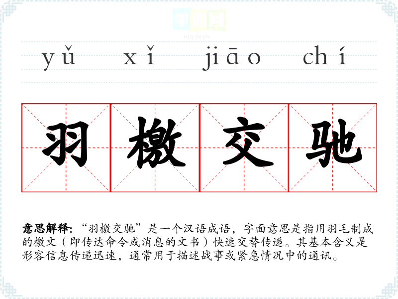 这个成语源自**古代的军事传信方式。在古代,羽檄是用羽毛制成的信件,常用于战场上传递命令和情报。成语的出典可以追溯到《史记·李将军列传》,其中提到在战争中快速传递消息的重要性,表现出信息传递的迅猛与高效。