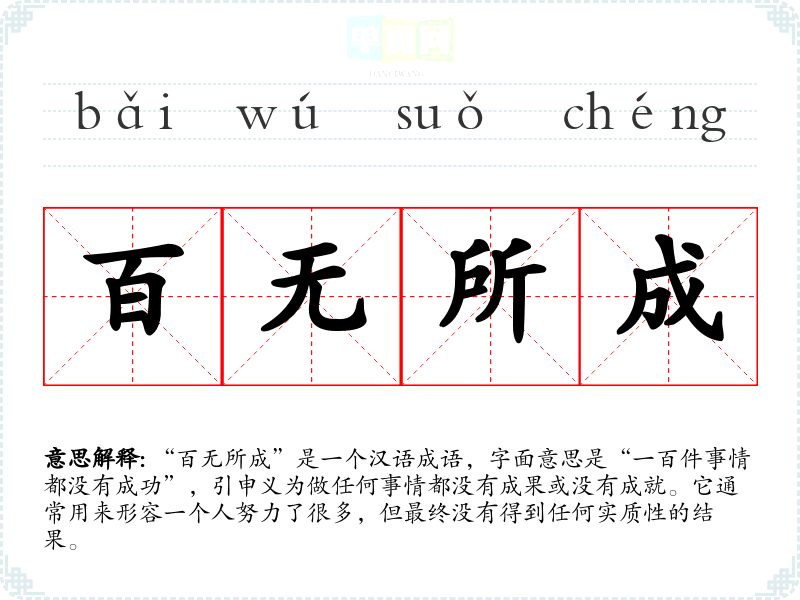 “百无所成”是一个汉语成语,字面意思是“一百件事情都没有成功”,引申义为做任何事情都没有成果或没有成就。它通常用来形容一个人努力了很多,但最终没有得到任何实质性的结果。