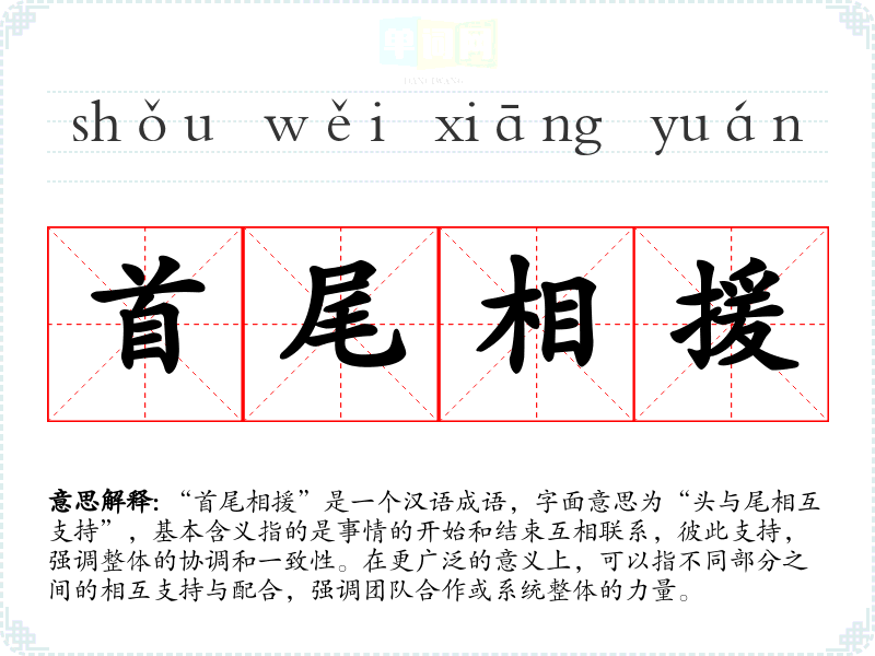 “首尾相援”是一个汉语成语,字面意思为“头与尾相互支持”,基本含义指的是事情的开始和结束互相联系,彼此支持,强调整体的协调和一致性。在更广泛的意义上,可以指不同部分之间的相互支持与配合,强调团队合作或系统整体的力量。
