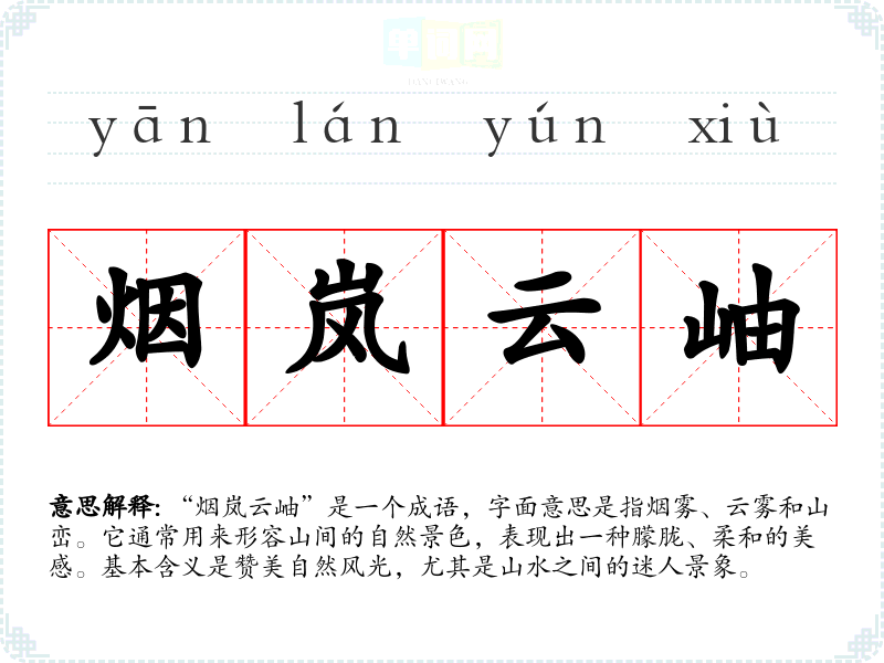 | 烟岚云岫 | 岚:雾气;岫:峰峦。形容山峦之间云雾之气弥漫缭绕。 |