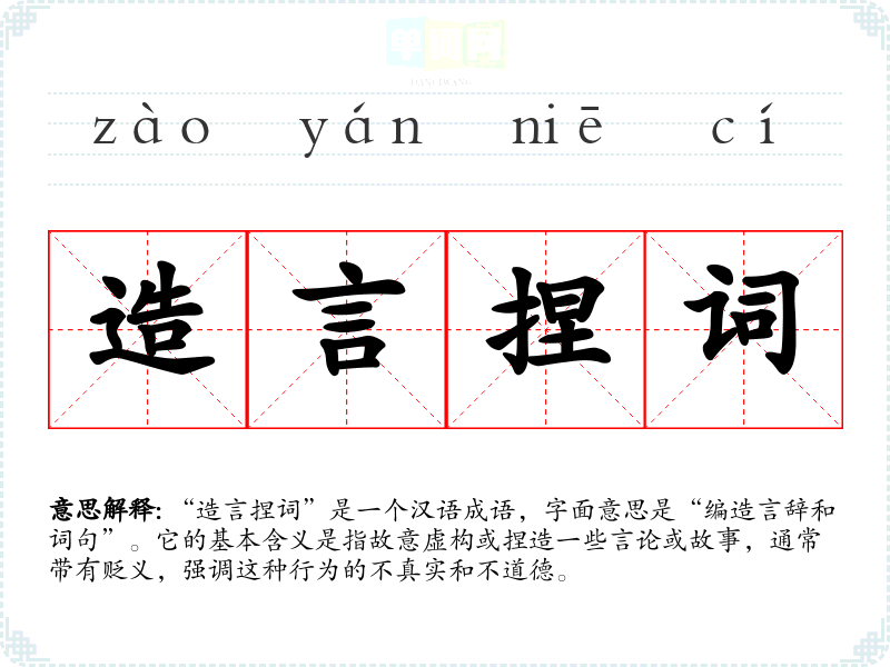 “造言捏词”是一个汉语成语,字面意思是“编造言辞和词句”。它的基本含义是指故意虚构或捏造一些言论或故事,通常带有贬义,强调这种行为的不真实和不道德。