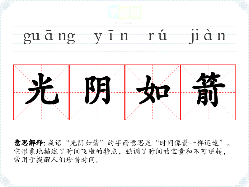 成语“光阴如箭”的字面意思是“时间像箭一样迅速”。它形象地描述了时间飞逝的特点,强调了时间的宝贵和不可逆转,常用于提醒人们珍惜时间。
