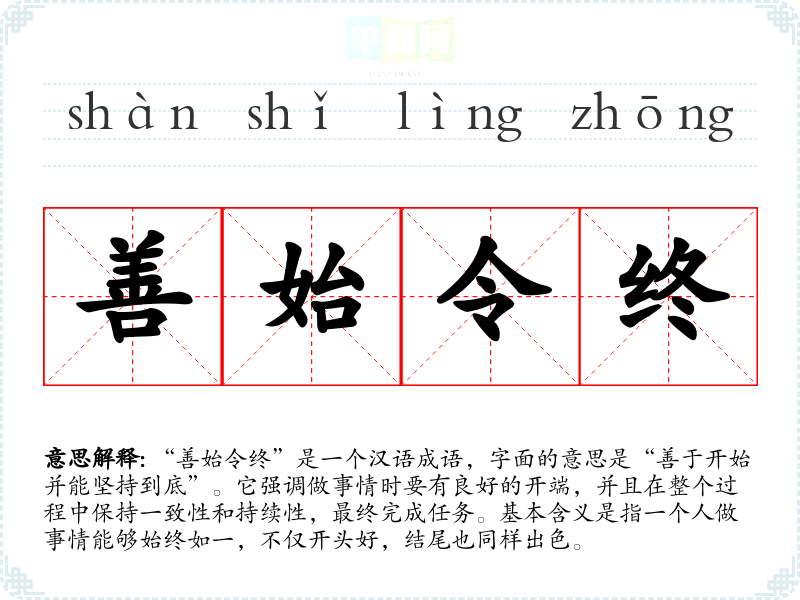 “善始令终”是一个汉语成语,字面的意思是“善于开始并能坚持到底”。它强调做事情时要有良好的开端,并且在整个过程中保持一致性和持续性,最终完成任务。基本含义是指一个人做事情能够始终如一,不仅开头好,结尾也同样出色。
