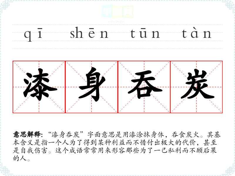“漆身吞炭”字面意思是用漆涂抹身体,吞食炭火。其基本含义是指一个人为了得到某种利益而不惜付出极大的代价,甚至是自我伤害。这个成语常常用来形容那些为了一己私利而不顾后果的人。