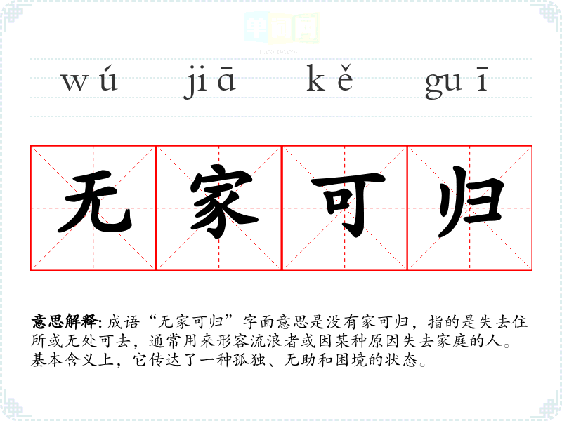 成语“无家可归”字面意思是没有家可归,指的是失去住所或无处可去,通常用来形容流浪者或因某种原因失去家庭的人。基本含义上,它传达了一种孤独、无助和困境的状态。