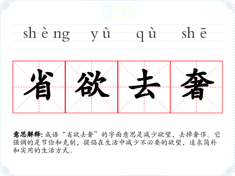 | 省欲去奢 | 免掉过分的欲念,去除奢侈。 |