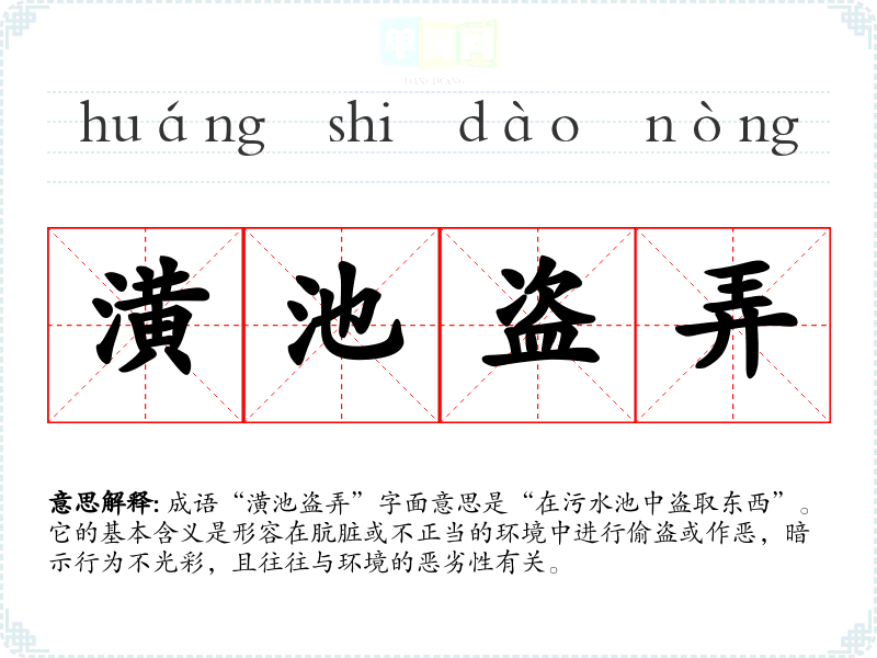 成语“潢池盗弄”字面意思是“在污水池中盗取东西”。它的基本含义是形容在肮脏或不正当的环境中进行偷盗或作恶,暗示行为不光彩,且往往与环境的恶劣性有关。