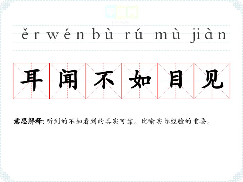 | 耳听是虚,眼见为实 | 虚:虚假。听到的不足信,亲眼看到的才真实可靠。 |