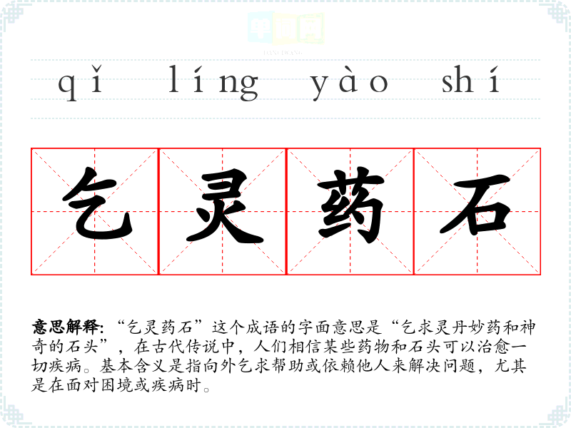 “乞灵药石”这个成语的字面意思是“乞求灵丹妙药和神奇的石头”,在古代传说中,人们相信某些药物和石头可以治愈一切疾病。基本含义是指向外乞求帮助或依赖他人来解决问题,尤其是在面对困境或疾病时。