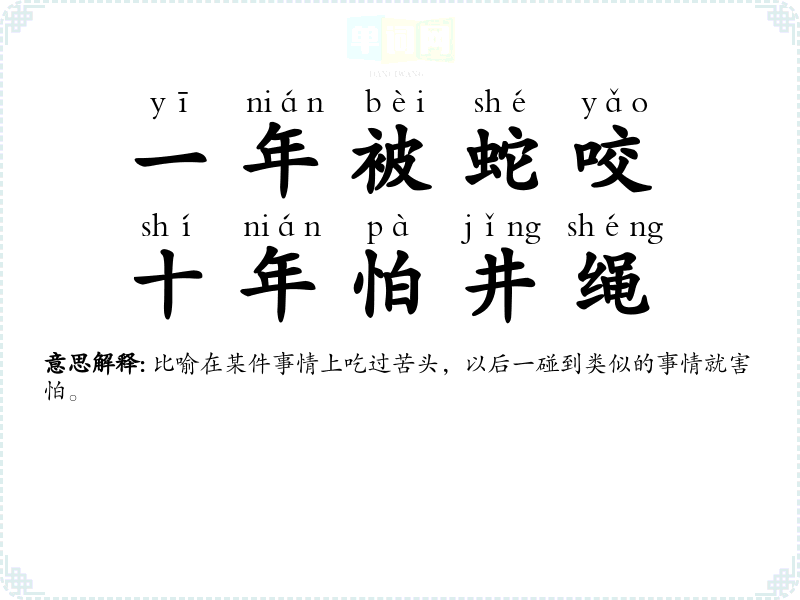 | 一着被蛇咬,三年怕井绳 | 比喻在某件事情上吃过苦头,以后一碰到类似的事情就害怕。 |