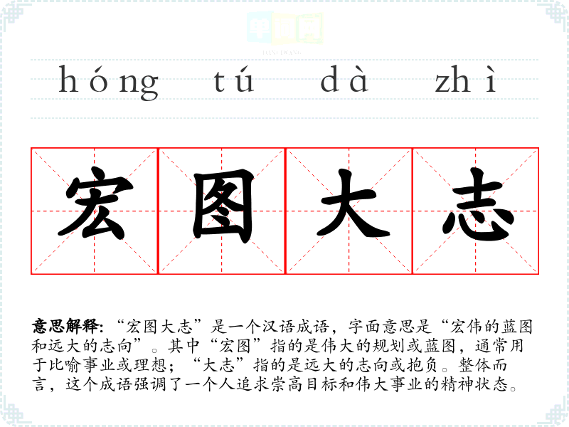 “宏图大志”并无明确的历史典故,属于常见的成语构成,主要由两个词语的组合形成。其使用可以追溯到古代文人对理想和志向的重视,类似的表述在古典文学中屡见不鲜。