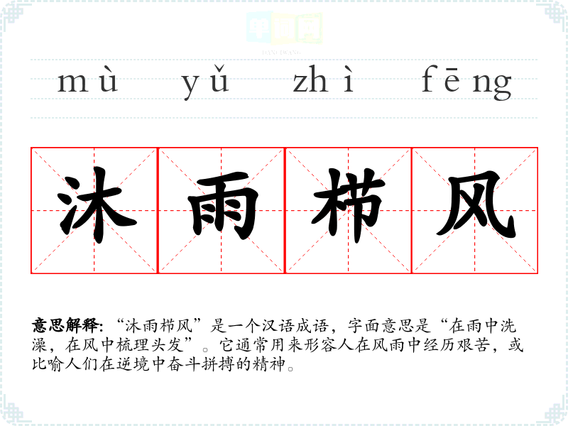 “沐雨栉风”是一个汉语成语,字面意思是“在雨中洗澡,在风中梳理头发”。它通常用来形容人在风雨中经历艰苦,或比喻人们在逆境中奋斗拼搏的精神。