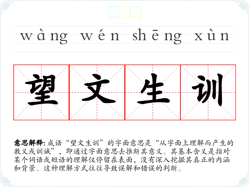 成语“望文生训”的字面意思是“从字面上理解而产生的教义或训诫”,即通过字面意思去推断其意义。其基本含义是指对某个词语或短语的理解仅停留在表面,没有深入挖掘其真正的内涵和背景。这种理解方式往往导致误解和错误的判断。