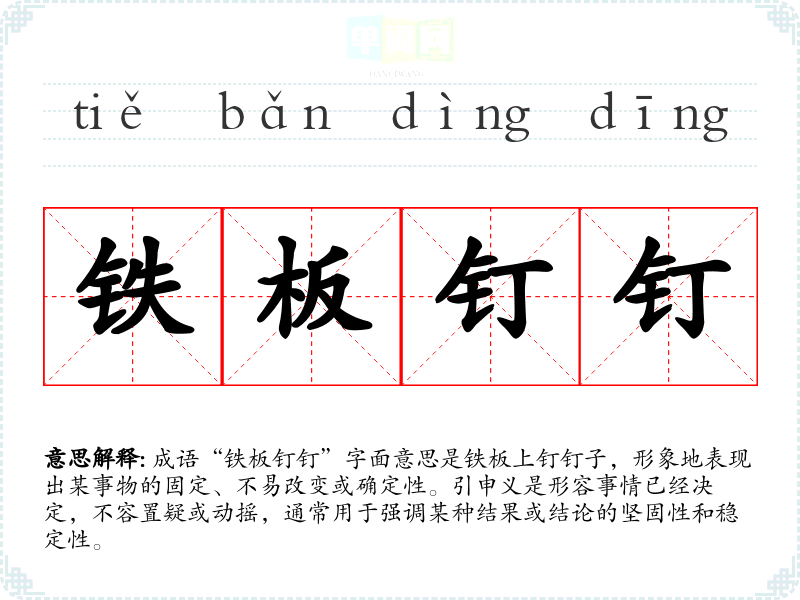 - 同义成语:一成不变、毫无疑问、万无一失。它们都强调事情的确定性和稳定性,但“铁板钉钉”更强调坚固和不会被轻易改变。