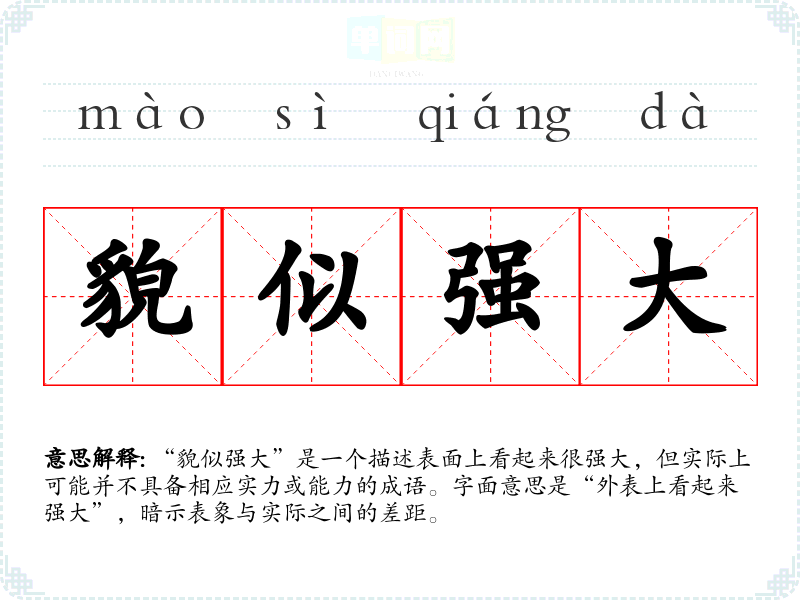 “貌似强大”是一个描述表面上看起来很强大,但实际上可能并不具备相应实力或能力的成语。字面意思是“外表上看起来强大”,暗示表象与实际之间的差距。